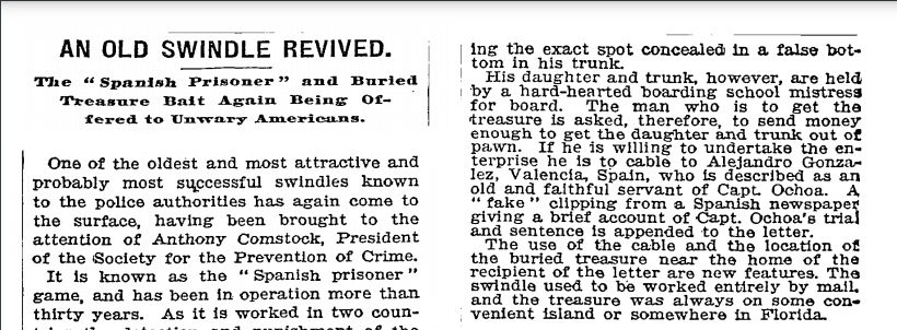 Figure 11: 1898 New York Times article on the Spanish Prisoner scam. (Source: New York Times32)