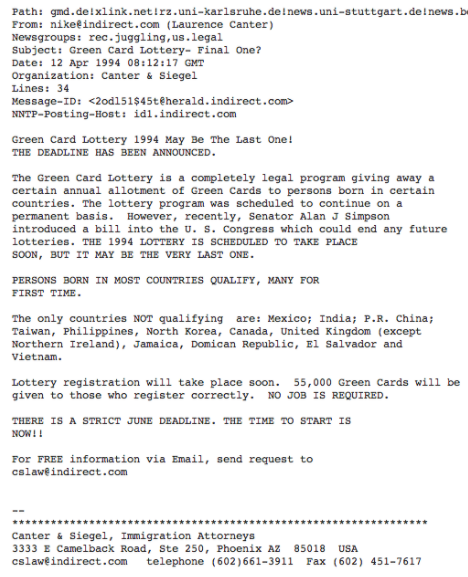 By 1994, the internet had undergone a notable shift away from computer science professionals to the general population, and away from the noncommercial order that had previously defined the net.41 Two immigration lawyers, a husband-and-wife law firm run by Laurence Canter and Martha Siegel, were eager to capitalize on this transition. Congress had recently devised the Green Card Lottery program to diversify immigration to the US, and less scrupulous lawyers like Canter and Siegel charged high fees in exchange for filing lottery entries for immigrants. On April 12, 1994, Canter and Siegel flooded Usenet newsgroups with messages promoting their services. Canter and Siegel had paid a programmer to write a basic script that pulled the names of all the newsgroups on a particular server and sent the message to each of them. It took one to two hours for the script to run its cycle and for Canter and Siegel’s message to be posted on nearly every newsgroup on Usenet.