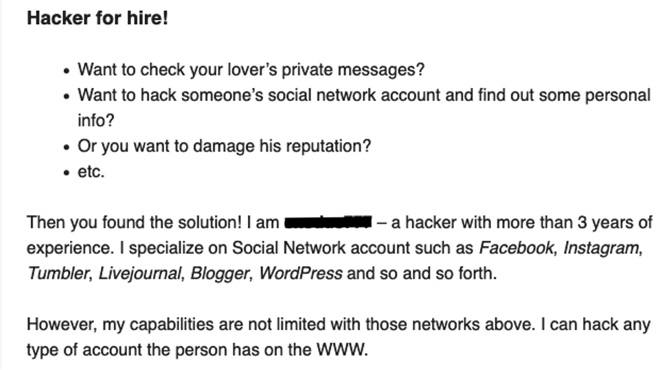 Figure 15: Screenshots from the Dark Web (January 2021) offering access to hacked accounts and hacker-for-hire services