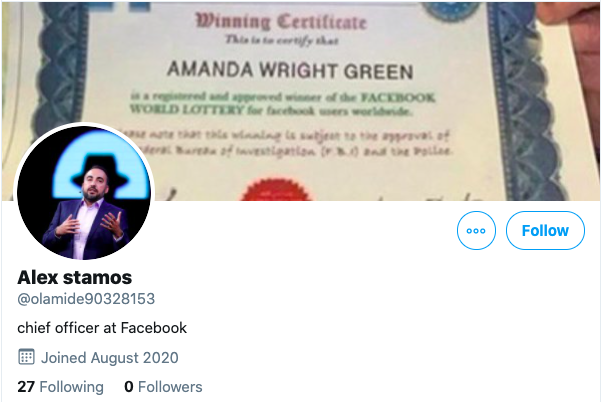 One particularly common use of fake accounts involves impersonating celebrities and executives–anyone from Mark Zuckerberg to Taylor Swift–to scam Facebook users out of cash. Perhaps the most impersonated person on the internet at the moment is Elon Musk. He’s so rich and eccentric that people believe he would actually send people Bitcoin. And so, as a result, there are a huge number of Elon Musk impersonators across social media platforms asking for bitcoin donations and offering to send a large sum of money in return.69 I have a tiny fraction of impersonators compared to Elon Musk, but it does happen, and it would happen on Facebook too. Most of my impersonators were encouraging people to buy Facebook sweepstakes tickets, who would then complain they did not get paid from Facebook sweepstakes.