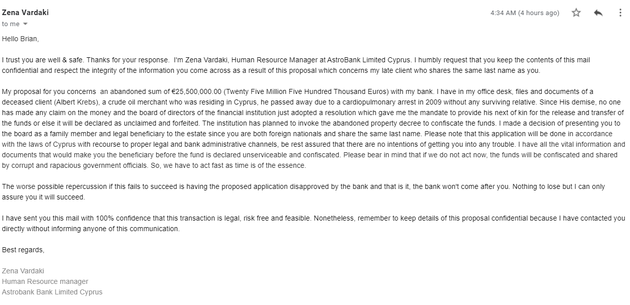 Figure 2: A 2020 version of the 419 scam. (Source: Brian Krebs12)