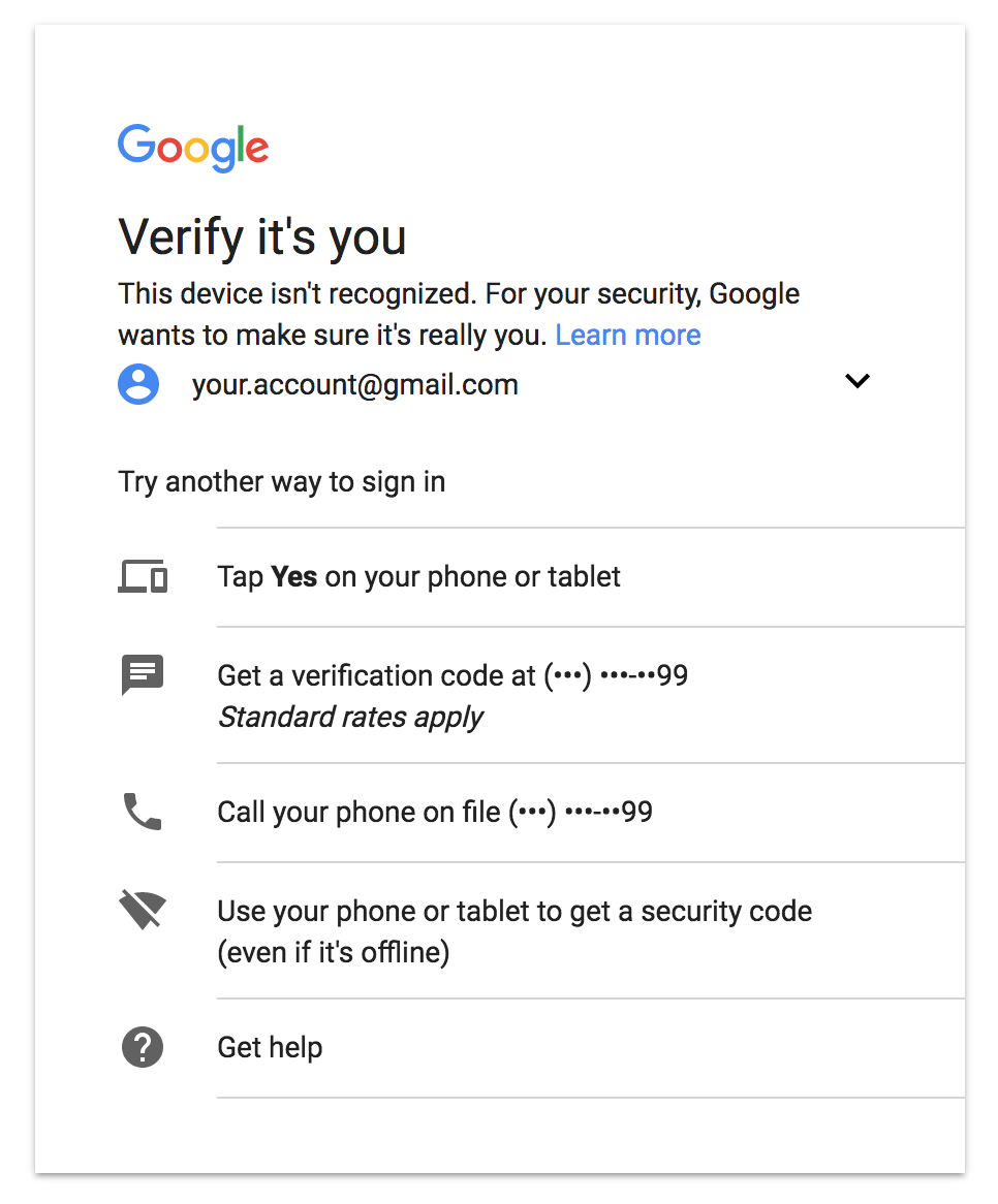 Let’s use Google as an example (see above). If a company has enabled multi-factor authentication for users, users will be given a number of different pre-authenticated options in order to access their account after entering their password. The security of these different options, however, is actually quite different. If the user has a pre-installed Google application on their phone or tablet that has verified them and that they have control over, that user will be reasonably secure against spam attacks. Getting a verification code, by contrast, is much less secure. There are a number of ways to compromise the SMS message or an individual’s SIM or phone directly, and there are no mechanisms right now for tech companies to find out if somebody’s phone number has changed.