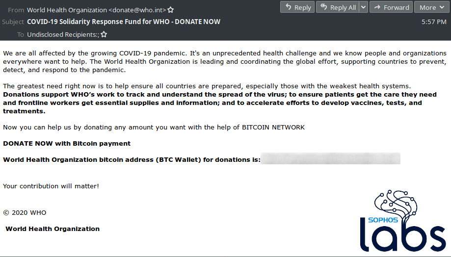 Figure 5: A scam email soliciting donations for the World Health Organization during COVID-19. (Source: identityforce.com21)