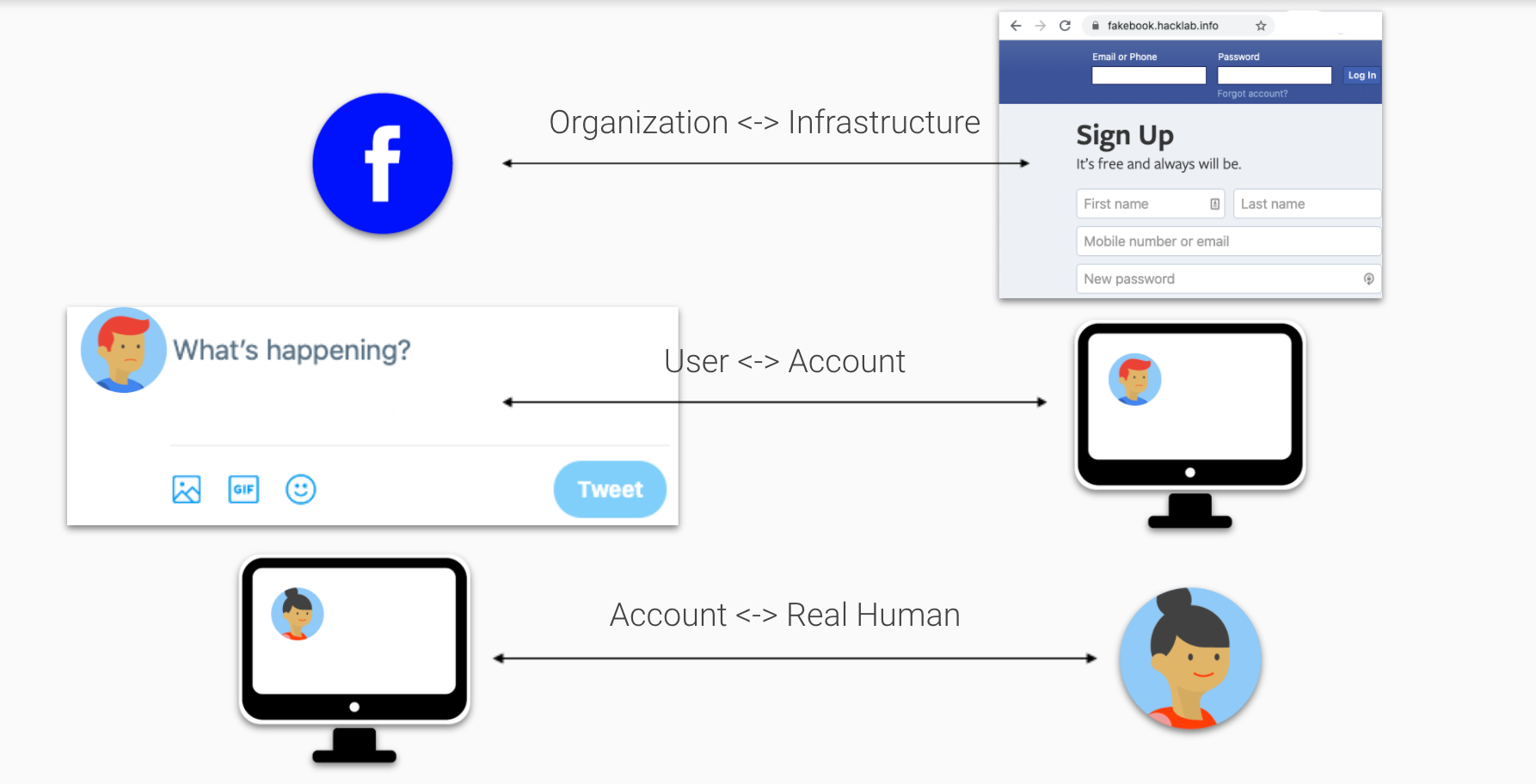 The internet has no fundamental conception of identity, other than the identity of the participant networks.23 Yet as the internet has become a hub of communication and commerce, we have bootstrapped new ideas of identity on top of it. The violation of these different identities is a key component of many of the harmful activities described in this book, including with spam and fraud. Broadly speaking, three major identity mappings are relevant to this discussion: the relationship between organizations and infrastructure, the relationship between users and accounts, and the relationship between accounts and real humans. In the following section, we examine how fraudsters take advantage of each of these three levels.