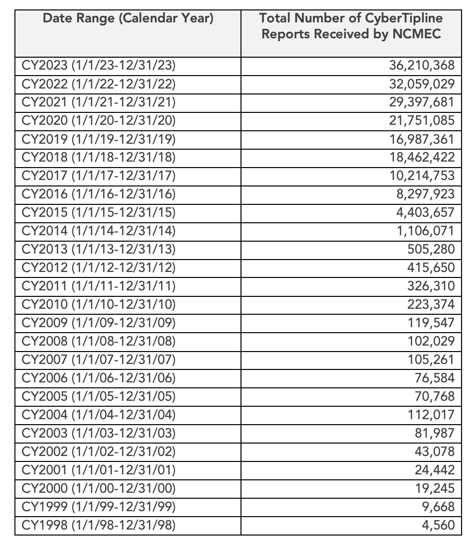 https://www.missingkids.org/content/dam/missingkids/pdfs/OJJDP-NCMEC-Transparency-CY-2023-Report.pdf ↩︎