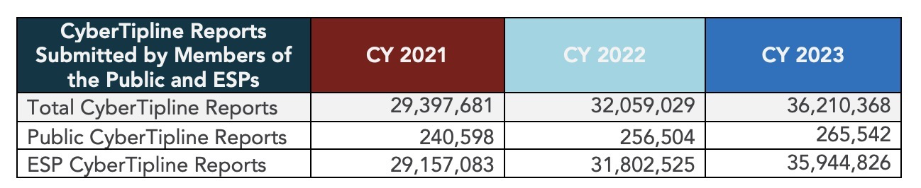 Table 2: In 2021 electronic service providers submitted about 29 million reports. In 2023 that number was almost 36 million. (Source: NCMEC42)